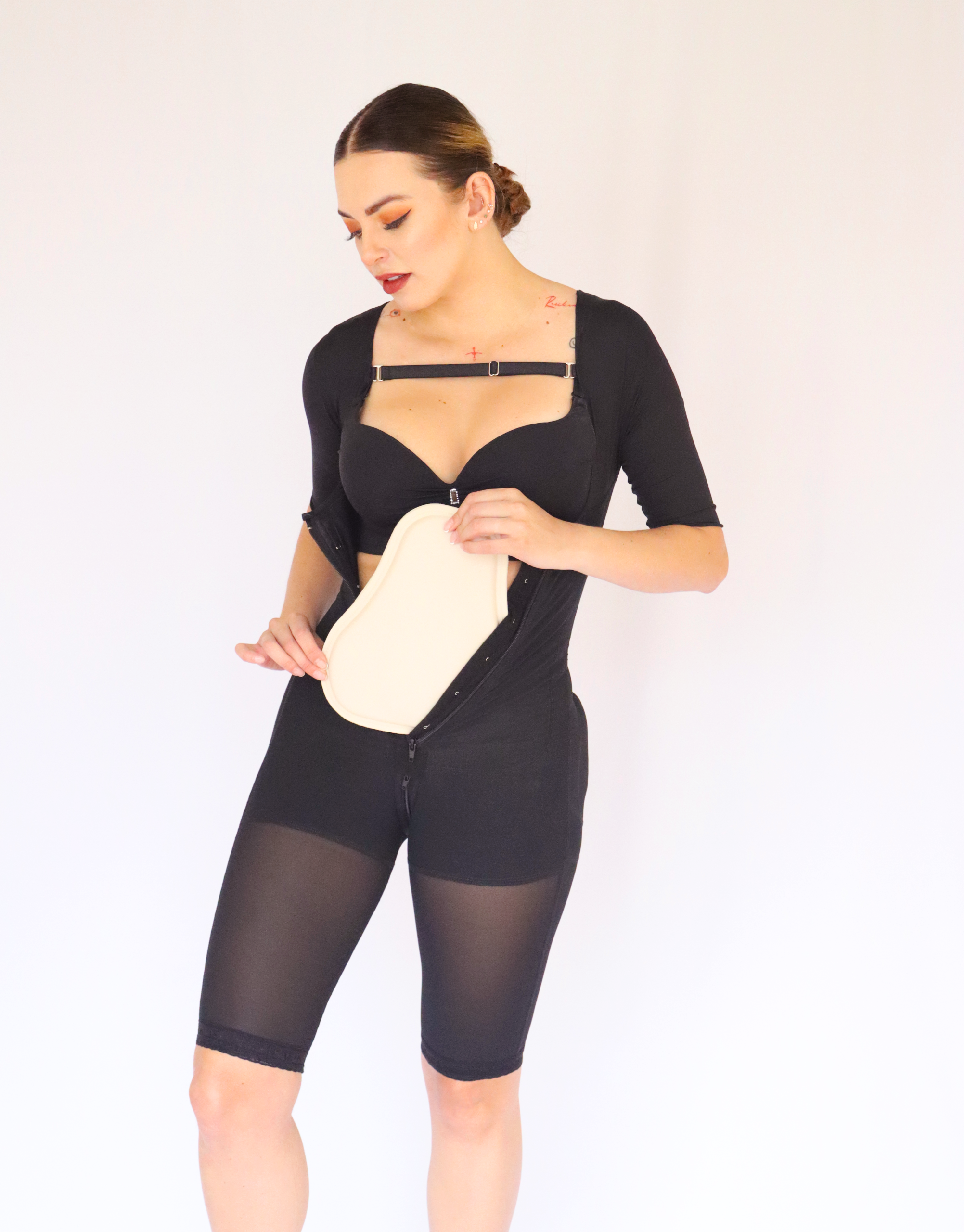 Permite que la piel se adhiera al musculo evitando pliegues, evita retención de líquidos y fibrosis post lipo.PARTE EXTERNA 100% POLIESTER – INTERNA 80% ESPUMA POLIURETANO 15% LAMINA POLIPROPILENO 5% RESINA ACRILICA